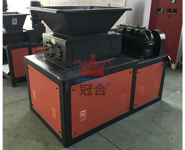 雙軸撕碎機將廢舊的編織袋,用機械直接送入新型編織袋粉碎機通過電機→傳動減速機→傳動主軸,由主軸上安裝的N把動刀與機架上安裝的定刀,將整捆的編織袋粉碎,經分離水槽將編織袋與雜物(石塊、等雜物)分離,到達可回收利用之原料。
